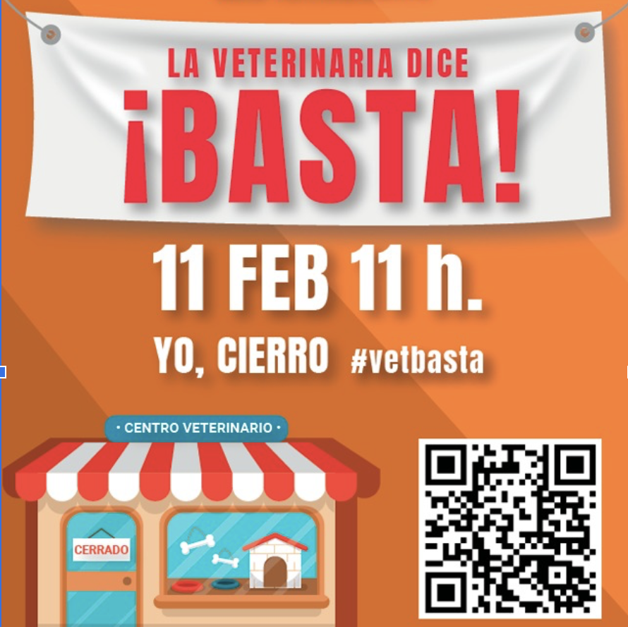 Cartel del dia 11 de Febrero “Basta ya”, anunciando el cierre simbólico de los centros veterinarios.